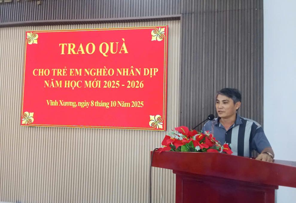 Sáng ngày 8/10/2025 tại hội trường Ủy ban nhân dân xã Vĩnh Xương, Ủy ban nhân dân xã tổ chức chương trình “Tiếp bước đến trường” năm học 2025-2026 nhằm hỗ trợ, động viên các em học sinh cận nghèo và hoàn cảnh khó khăn trước thềm năm học mới, do Trung tâm bảo trợ xã hội tỉnh An Giang hỗ trợ.