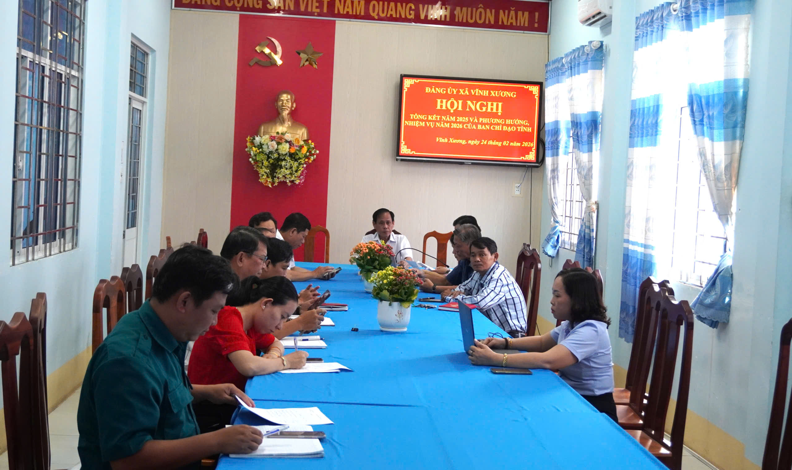 Tại điểm cầu xã Vĩnh Xương có ông Trần Hòa Hợp, Bí thư Đảng ủy – Chủ tịch HĐND xã và các thành viên Ban Chỉ đạo xã về phát triển khoa học, công nghệ, đổi mới sáng tạo và chuyển đổi số.