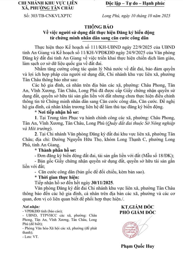 Về việc người sử dụng đất thực hiện Đăng ký biến động từ CMND sang CCCD