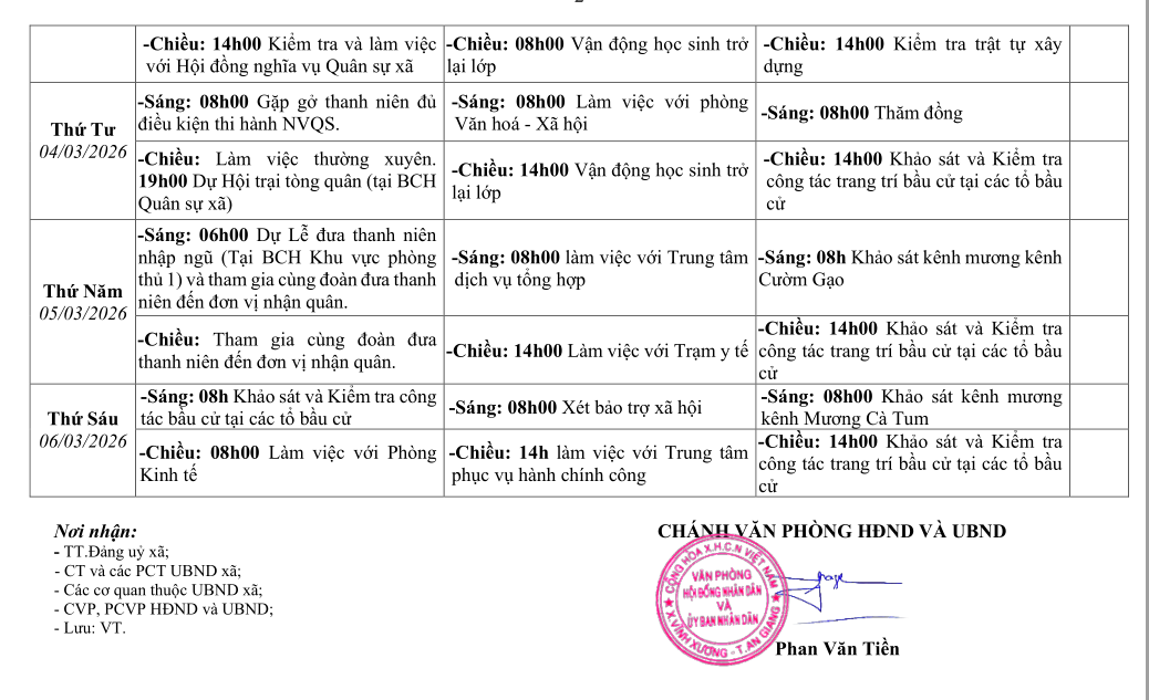 THÔNG BÁO Lịch làm việc của Lãnh đạo UBND xã Vĩnh Xương (Từ ngày 02/03/2026 đến ngày 06/03/2026)