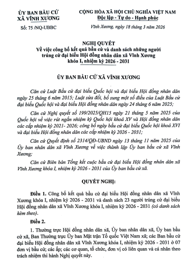 THÔNG BÁO VỀ VIỆC BAN HÀNH NGHỊ QUYẾT CÔNG BỐ KẾT QUẢ BẦU CỬ VÀ DANH SÁCH NHỮNG NGƯỜI CHÚNG CỬ ĐẠI BIỂU HỘI ĐỒNG NHÂN DÂN XÃ VĨNH XƯƠNG KHÓA I, NHIỆM KỲ 2026- 2031