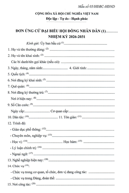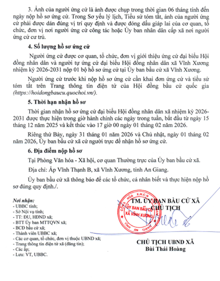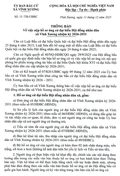 THÔNG BÁO VỀ VIỆC NỘP HỒ SƠ ỨNG CỬ ĐẠI BIỂU HỘI ĐỒNG NHÂN DÂN XÃ VĨNH XƯƠNG, NHIỆM KỲ 2026-2031
