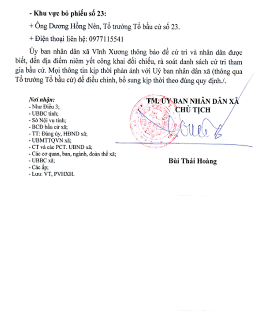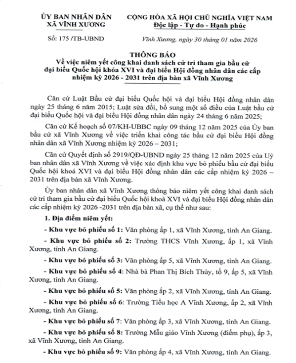 THÔNG BÁO V/V NIÊM YẾT CÔNG KHAI DANH SÁCH CỬ TRI THAM GIA BẦU CỬ ĐẠI BIỂU QUỐC HỘI KHOÁ XVI VÀ ĐẠI BIỂU HỘI ĐỒNG NHÂN DÂN CÁC CẤP NHIỆM KỲ 2026- 2031 TRÊN ĐỊA BÀN XÃ VĨNH XƯƠNG
