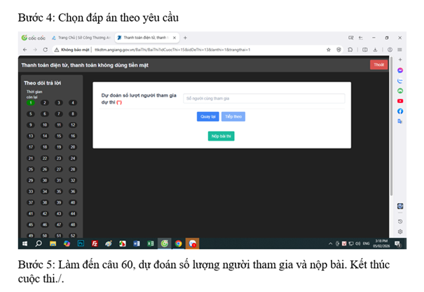 - Người dự thi cần trả lời câu hỏi khảo sát trước khi bắt đầu thi. Trong thời gian do Ban Tổ chức quy định (kể từ khi bộ đề có các câu hỏi trắc nghiệm hiện ra), thí sinh phải chọn đáp án đúng nhất ở mỗi câu có sẵn 04 đáp án A, B, C, D mà Ban Tổ chức gợi ý. Khi thí sinh trả lời hết các câu hỏi của Ban Tổ chức đặt ra, và dự đoán lượt người tham gia dự thi. Sau đó, nhấn nút “Nộp bài” hệ thống phần mềm tự động tính giờ làm bài của thí sinh. Sau khi hết thời gian quy định, phần mềm tự động ngắt và thông báo kết quả.