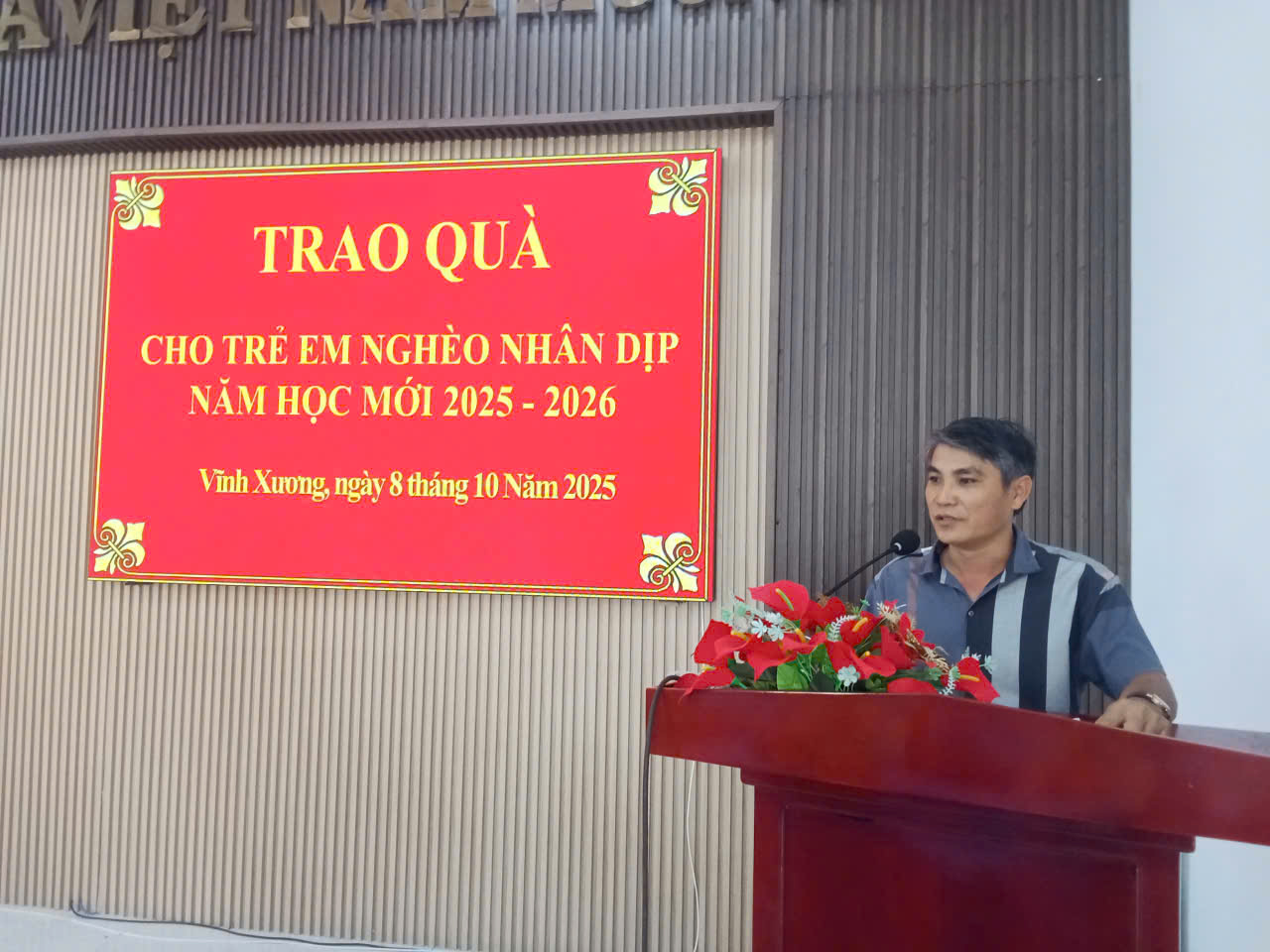 Phát biểu tại buổi lễ Đ/C Nguyễn Minh Tài Ủy Viên Ban thường vụ- Phó chủ tịch UBND xã Vĩnh Xương đã ghi nhận và cảm ơn đến Trung tâm bảo trợ xã hội tỉnh An Giang đã đồng hành cùng địa phương trong công tác chăm lo cho thế hệ tương lai. Đồng thời gửi lời động viên đến các em học sinh hãy tiếp tục cố gắng, vượt qua khó khăn, chăm ngoan học giỏi để xứng đáng với sự quan tâm của xã hội.