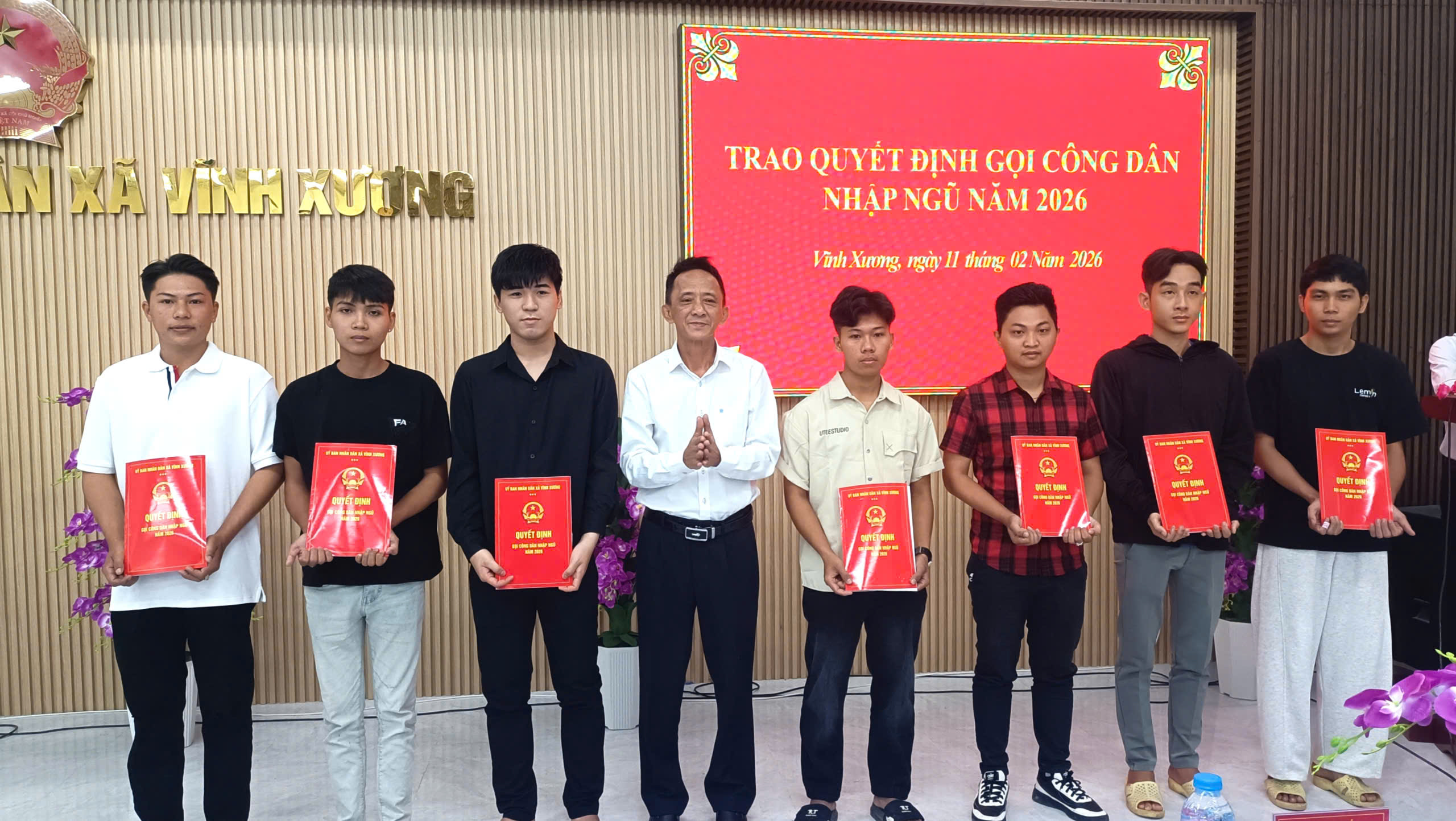 Sáng ngày 11/2/2026, Ủy ban nhân dân và Hội đồng Nghĩa vụ quân sự (NVQS) xã Vĩnh Xương tổ chức Lễ trao quyết định gọi công dân nhập ngũ thực hiện nghĩa vụ quân sự và nghĩa vụ tham gia Công an nhân dân năm 2026.
