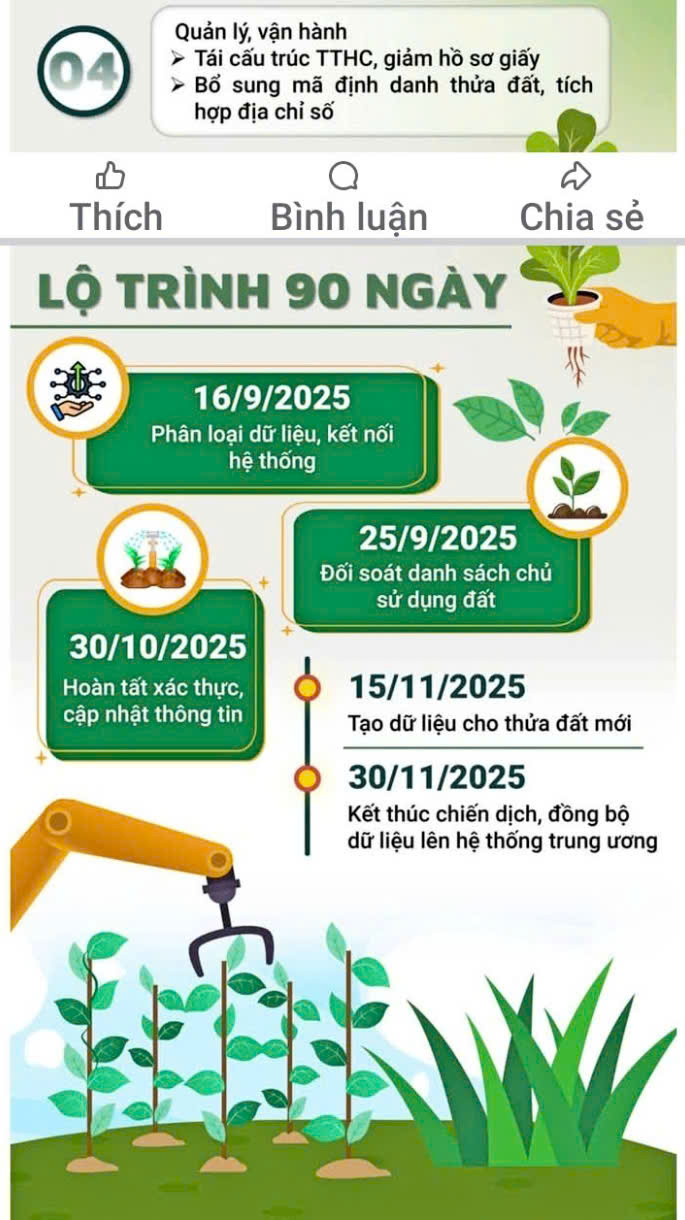 Tại hội nghị, UBND xã đã công bố Quyết định thành lập Ban Chỉ đạo Chiến dịch 90 ngày và triển khai hướng dẫn các nội dung trọng tâm, bao gồm: Rà soát, phân loại, chỉnh lý và cập nhật thông tin để hoàn thiện cơ sở dữ liệu đất đai hiện có, bảo đảm tiêu chí “đúng – đủ – sạch – sống”; Thu thập, số hóa giấy tờ, tài liệu liên quan phục vụ xây dựng, tạo lập dữ liệu đất ở, nhà ở đối với các trường hợp chưa có dữ liệu, góp phần làm giàu cơ sở dữ liệu đất đai; Đồng bộ, kết nối và chia sẻ dữ liệu đất đai của tỉnh với Cơ sở dữ liệu Quốc gia về đất đai do Bộ Tài nguyên và Môi trường quản lý, đồng thời kết nối với Cơ sở dữ liệu Quốc gia về dân cư và các cơ sở dữ liệu khác của các Bộ, ngành Trung ương; Triển khai vận hành, khai thác và sử dụng cơ sở dữ liệu đất đai trong giải quyết thủ tục hành chính, cung cấp dịch vụ công trực tuyến; Đảm bảo an ninh, an toàn và bảo mật thông tin, dữ liệu theo quy định.